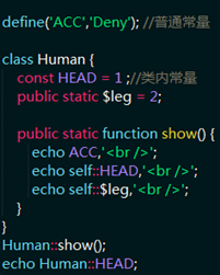 类内常量 : 类常量 在类内用 const 声明即可;前面不用加修饰符,;且权限是public的,即外部也可以访问
