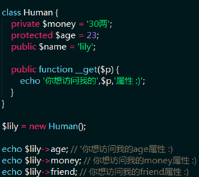 __get() :当我们调用一个权限上不允许调用的属性,和不存在的属性时,__get魔术方法会自动调用,并且自动传参,参数值是属性名。酱紫就能避免系统会直接报错,甚至fatal error,通过__get()我们就能自定义用户访问时的处理行为。注意如果是数组形式的话那么这里的$p相当于键值(即是下标)