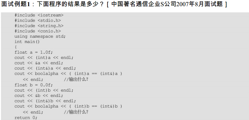 1 #include <iostream> 2 #include <stdio.h> 3 #include <string.h> 4 #include <conio.h> 5 #include <stdlib.h>//与#include<cstdlib>效果一样:包含 system()函数 6 using namespace std; 7 8 int main() 9 { 10 float a = 1.0f; 11 12 cout << sizeof(int) <<endl;//4 13 cout << sizeof(float) <<endl;//4 14 15 cout << (int)a << endl;//1 16 cout << &a << endl; /*取a的地址十六进制0012FF7C*/ 17 cout << (int)&a << endl;/*(int)&a:把a的地址强制转换成十进制的整型1245052*/ 18 cout << (int&)a << endl; 19 /*(int&)a:将a的引用强制转换为整型,意思是a所在的内存,本来定义的时候为float类型,并初始为1.0f, 20 但现在我要按int类型解释这段内存(也就是说a所在的内存地址中的数据本来是按float型存储表示的,你非要按int型来解释不可)。 21 1.0f 在内存中的存储为 22 0 011 1111 1 000 0000 0000 0000 0000 0000. 23 把他按整型数解释为2^29+2^28+2^27+2^26+2^25+2^24+2^23=1065353216 24 25 (int&)a 相当于 26 *(int*)&a 27 28 *(int*)(&a) 29 30 *((int*)&a) 31 32 */ 33 34 cout << boolalpha << ((int)a == (int&)a ) << endl;// 输出false.因为1!=1065353216. 35 36 float b = 0.0f; 37 cout << (int)b << endl;//0 38 cout << &b << endl;/*取b的地址十六进制0012FF78*/ 39 cout << (int&)b << endl;//0 40 cout << boolalpha << ((int)b == (int&)b ) << endl;// 输出true,因为0==0; 41 42 /* 43 (int&)a 不经过转换, 直接得到a在内存单元(就是地址)的值 44 (int)a a在内存中的值转换成int类型 45 46 float类型在内存中存储的形式是 ,符号位 指数 尾数 47 由754标准:阶码采用增码(该数补码的反符号),尾数采用原码 48 所以1.0f 在内存中的形式为 49 0011 1111 1000 0000 0000 0000 0000 0000 50 所以输出的是 0x3f800000 51 0 在内存中的的存储形式 52 0000 0000 0000 0000 0000 0000 0000 0000 53 */ 54 system("pause"); 55 return 0; 56 }