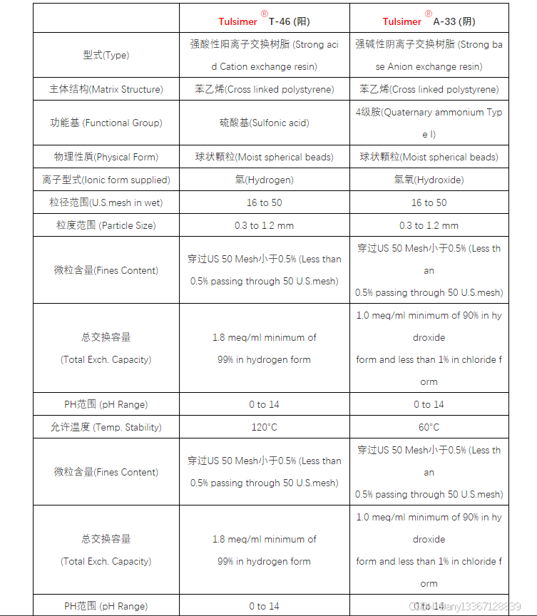 Tulsimer ® MB-106UP为阶核子级抛光树脂, 是由核子级强酸型阳离子Tulsimer ® T-46Li 及核子级强碱型阴离子 Tulsimer ® A-33OH 以1:2 体积比的剂量比例 , 预先混合的混床级离子交换树脂,专门提供给超纯水系统抛光用,具有的交换容量及优越的物理特性。适合用于电子产业 ,生产半导体及映像管产业,实验室,激光,精仪器,医用行业等需要超纯水的行业,以及核电厂等使用。在全球我们有数十家 核电厂使用我们的抛光树脂。