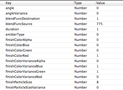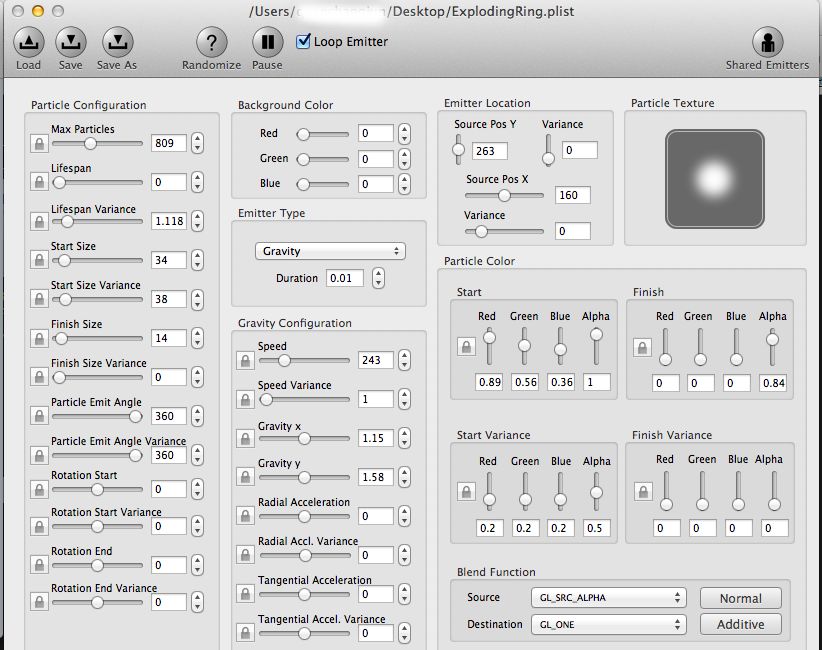 设置好以后,你可以在ParticleDesigner中load这个.plist文件,来查看效果是否正确,如果不对,那么你就要仔细检查一下设置是否正确。如果你愿意花钱,那么就不用做手动劳动,直接save导出.plist文件就可以了。