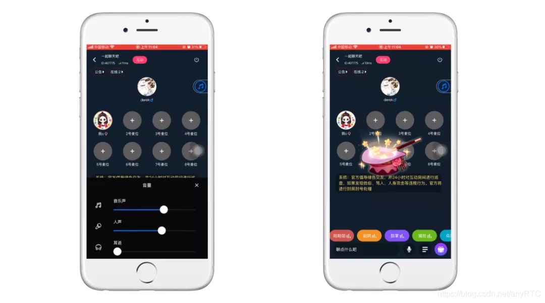 无论是纯语音的Clubhouse还是娱乐为主的语音直播类软件,市场需求都是很大的,都可以通过anyRTC语音连麦Demo来集成。比如添加娱乐互动的功能如送礼物、播放背景音乐、调节音乐声、人声、和耳返的声音等功能。开发者可以根据自己的的受众群体选择做哪一种软件。