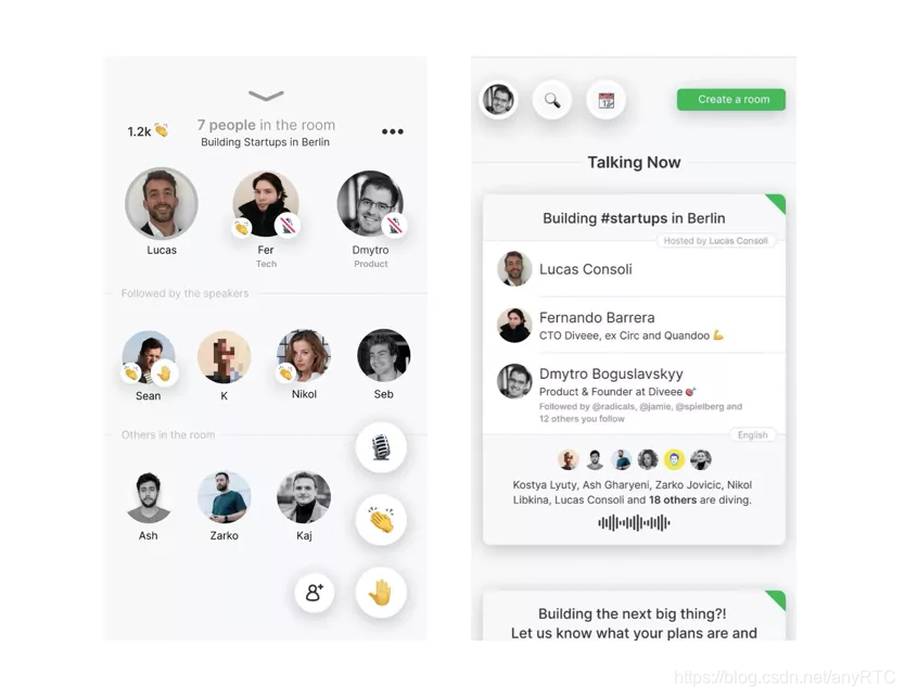 Clubhouse的爆火让国内很多厂商看到了语音社交这个领域的商机,开始纷纷设计开发自己的语聊软件,anyRTC很早就意识到了这一点,开发了语音连麦Demo。可以基于这个Demo搭建属于自己的Clubhouse。为了让开发者更能快速的切入语聊业务,让开发者一分钟跑通Demo,20分钟熟悉语聊业务流程,一周上线自己的语聊场景。下面简单介绍一下语音连麦Demo的功能。