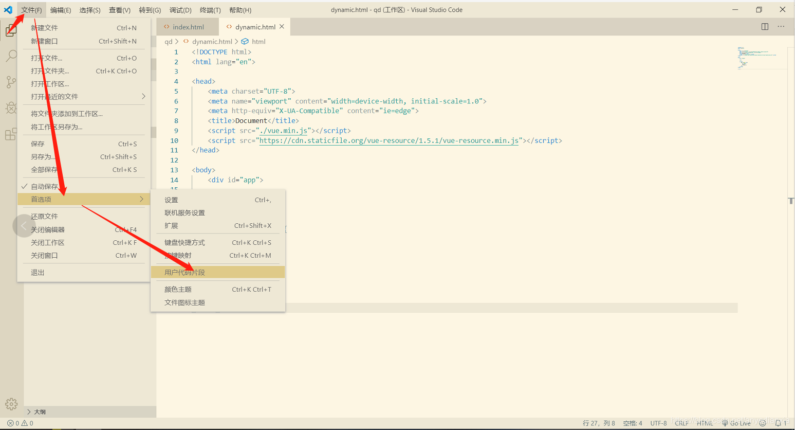 保存后关闭,查看效果,在html文件中输入vh后按tab或enter快速引入文件中的代码片段: