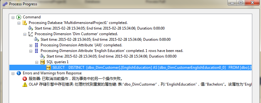 然后部署这个项目,收到下图所示的异常信息,EnglishEducation里的Bachelors出现重复属性键,具有Bachelors学士学位的Customer有很多人,这个太正常不过了,出了什么状况呢?我们展开下图高亮所示的Processing English Education日志,找到具体的sql脚本复制出来看看