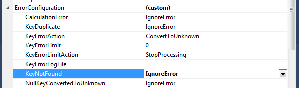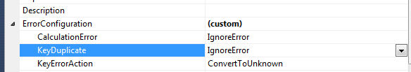 不难料见,SSAS在处理维度数据时也是做了同样的数据清洗工作,而数据库的distinct不能如此简单暴力的做这种清洗工作,SSAS之所以会报找到重复键的异常,简单理解就是SSAS向数据库请求distinct去重的Education列表,数据库查询出来并给到SSAS后,SSAS又自作主张进行了一些清洗工作,然后发现有重复项,总之这个问题是由于MSSQL和SSAS对字符串的处理不一致造成的。这个异常警告是没什么影响的,在ErrorConfiguration里设置KeyDuplicate为Ignore即可,当然,如果你有洁癖强迫症,也可以在etl过程中做手工清洗去除这些特殊字符。。。