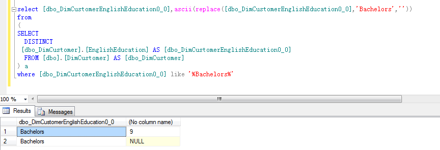 update DimCustomer set EnglishEducation = 'Bachelors'+N' ' where CustomerKey=11000 update DimCustomer set EnglishEducation = 'Bachelors'+' ' where CustomerKey=11001