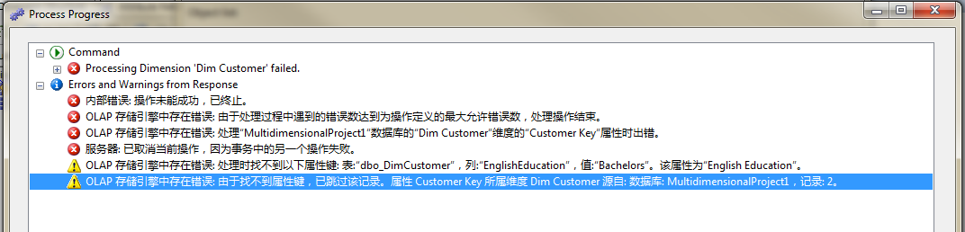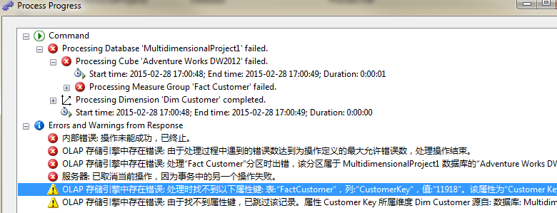 而如果是对整个cube进行process full,还是会报以下错误信息,奇怪的是报错的CustomerKey是完全不相干的11918,不清楚具体原因了