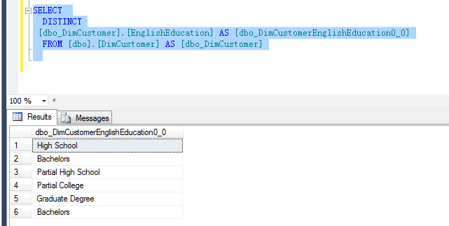 复制出来的脚本是个distinct查询,执行后如下图所示,问题来了,不难发现第2行和第6行都是Bachelors,的确是重复了(实际生产环境可能无法肉眼识别重复项),那么为什么distinct没起作用呢?