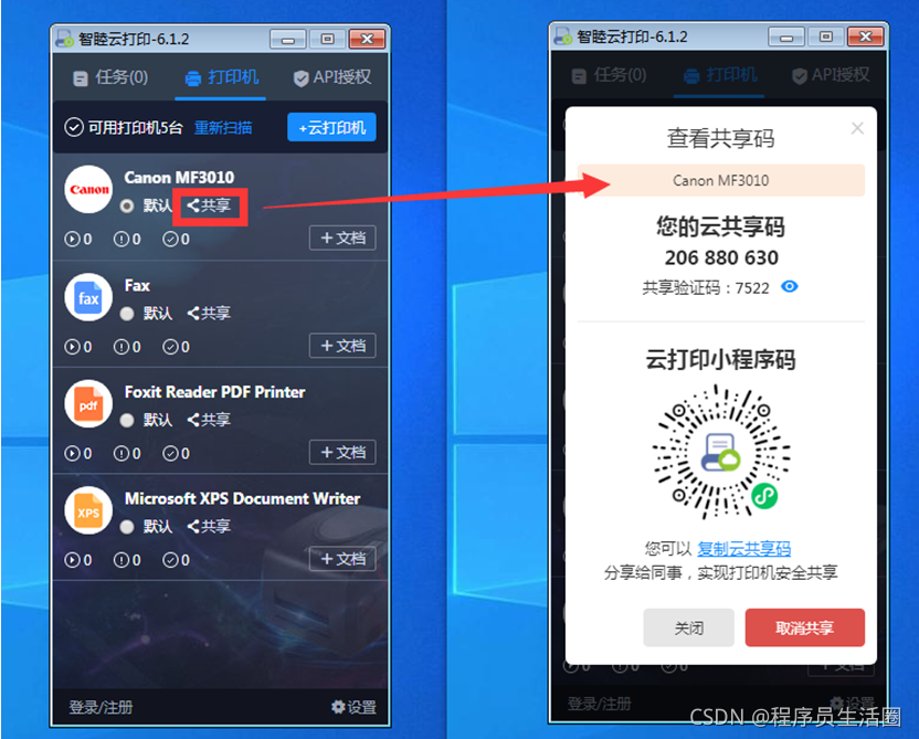 1、Windows电脑客户端启动后,客户端会自动扫描当前电脑安装的“本地打印机”及已添加的其他电脑共享的云打印机;共享打印机时只需选择具体的打印机,点击“共享”,复制云共享码发送给同事。