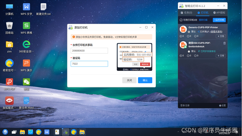 2、打开“智睦云打印”点击控制台【+云打印机】,在弹窗中输入Windows系统共享的打印机“云共享码”和“共享验证码”(本例中分别为“共享码:206 880 630”和“验证码:7522”),点击确认,麒麟系统即已成功添加Windows共享的打印机。