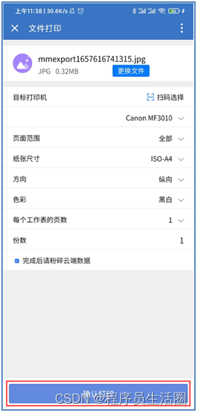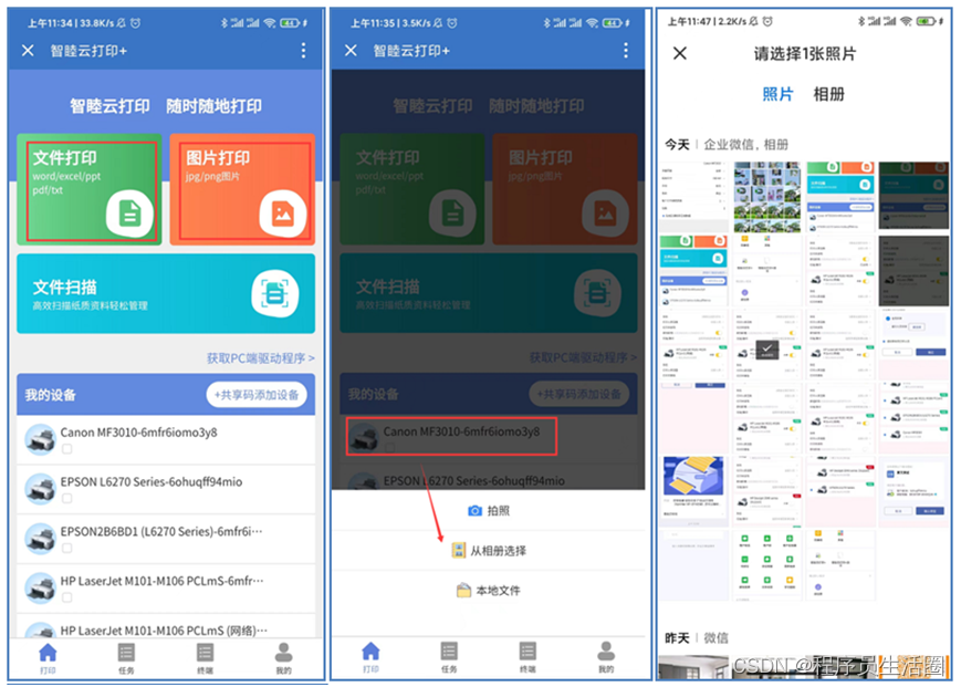 ( 1 )打印文件 : 你可以根据需要选择 “ 文件打印 ” 或 “ 图片打印 ” , 也可以直接选择设备进行打印。此处我们以选择设备打印为例,首先点打印机>从相册选择,选择要打印的图片 >文件打印页点确认打印即可打印成功