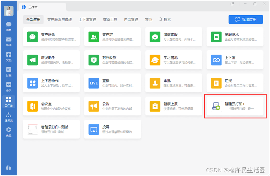 打开手机企微 > 工作台 >添加应用 > 搜索应用,输入"智睦云打印" > 添加 > 添加应用 > 同意以上授权,并添加