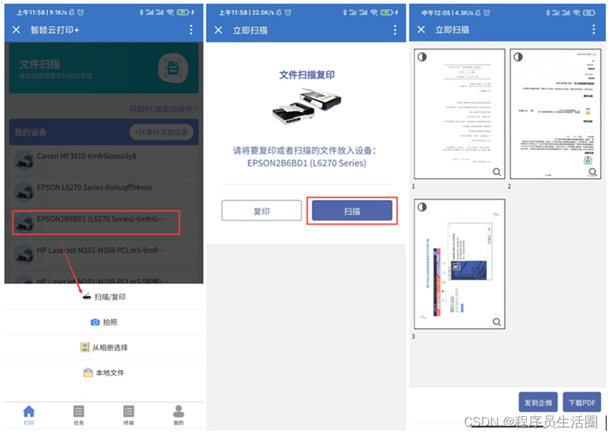 ( 2 ) 扫描文件:首先点打印机 > 点扫描/复印 > 进入文件扫描复印页 > 点扫描 > 文件扫描完成后直接下载 PDF 扫描文件即可。