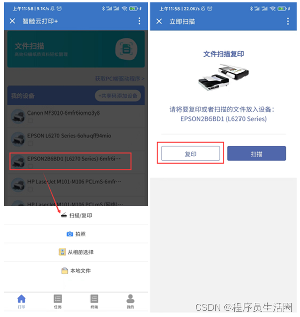 ( 3 ) 复印文件 : 首先点打印机 > 点扫描 / 复印 > 进入文件扫描复印页 > 点复印 > 等待打印机出纸即可。