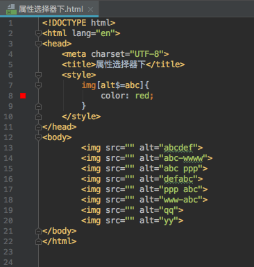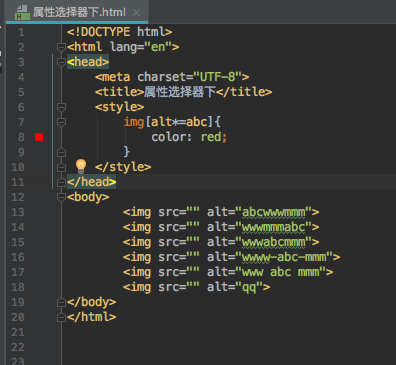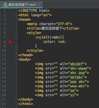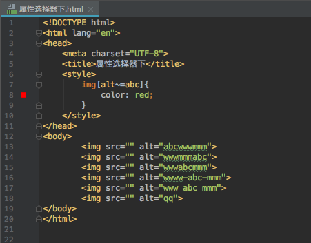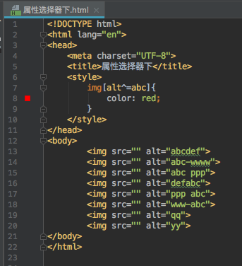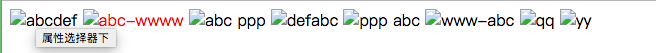 先找到所有的img标签,再找到img标签中有alt属性,并且alt属性是以abc开头的,于是就找到了前面三个,它就会将文字颜色改为红色了