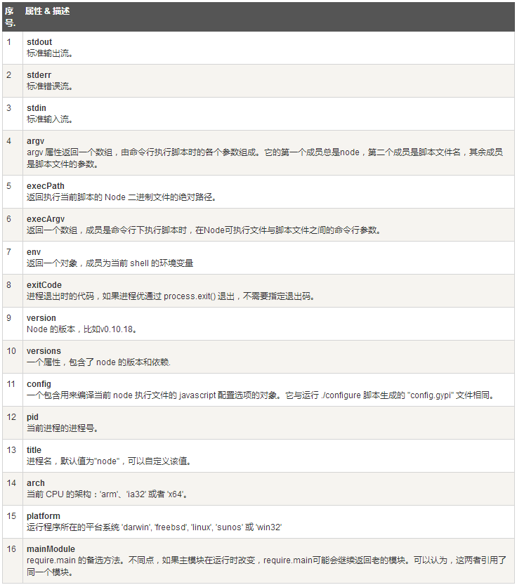 | 它用于描述当前Node.js 进程状态的对象,提供了一个与操作系统的简单接口。通常在你写本地命令行程序的时候,少不了要 和它打交道。下面将会介绍 process 对象的一些最常用的成员方法 process 是一个全局变量,即 global 对象的属性。