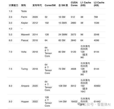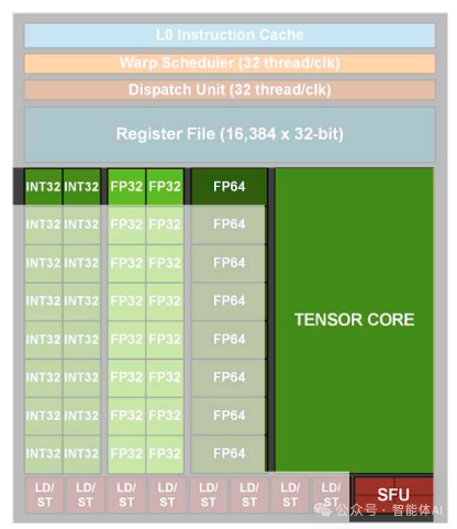随着架构的演变,CUDA Core的定义变得复杂。例如,在最新的Ampere架构中,CUDA Core主要指FP32计算单元(负责32位浮点运算)。这使得不同代际的CUDA Core数量不能直接比较其性能。