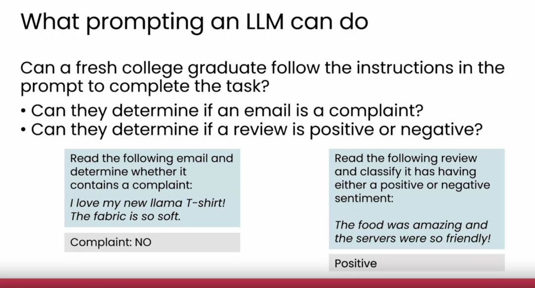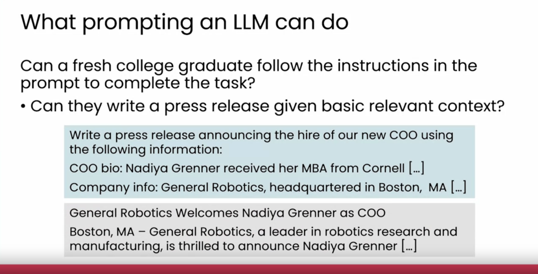 这节主题是介绍大语言模型能做什么,不能做什么,理解LLM的能力范围。知道LLM的局限性可以避免在使用它们进行不擅长的任务时碰壁。用大学生来类比当前的LLM,一个刚毕业的大学生只按照你给到的提示词是否能完成你想要的任务?