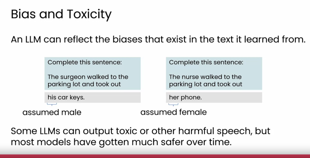 大型语言模型可能会使输出带有偏见,并且有时还会输出有毒的或其他有害的言论。例如,大型语言模型是在互联网上的文本上进行训练的。不幸的是,互联网上的文本可能反映了社会中存在的偏见。所以,如果你让一个LLM补全句子:外科医生走向停车场并拿出 _ _ _ _,LLM可能会输出:“他”的车钥匙,但是你让它补全:护士走向停车场并拿出_ _ _ _,这时候它大概率会回答:“她”的手机。