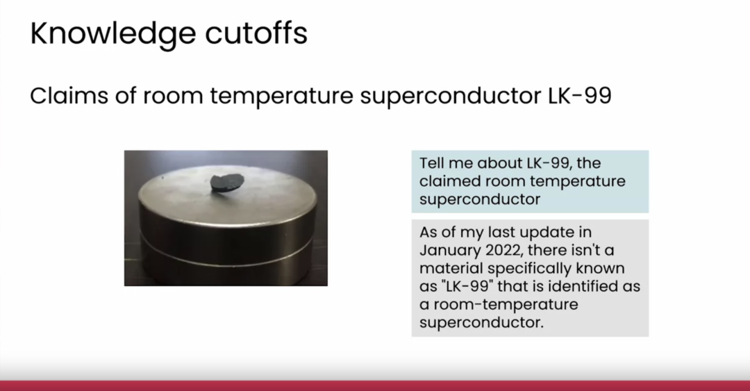 大语言模型对世界的认知在它训练完成的时候就被固定了,LLM只知道世界在某一个特定时间之前的事情,如果你去问它关于室温超导LK-99的问题那么大概率它会拒绝回答,这个现象就是“知识截止”。