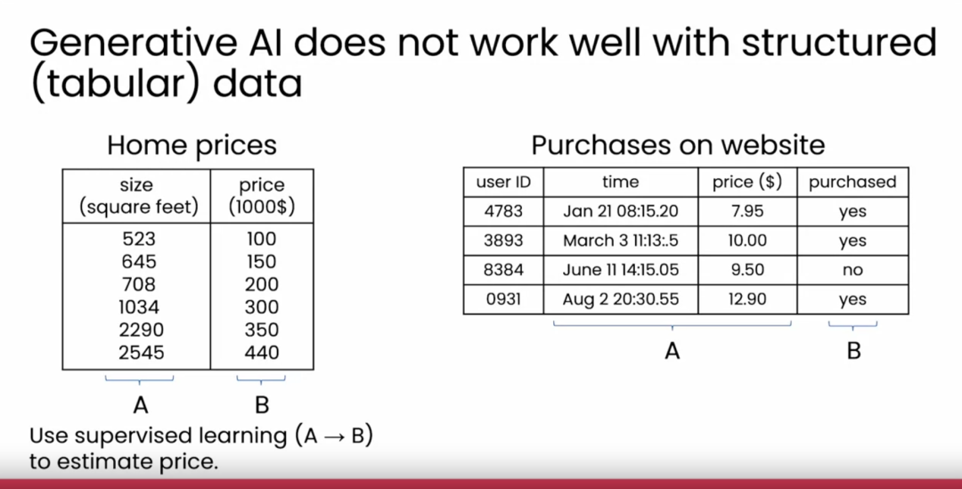 另外一个问题就是生成式AI目前在处理结构化数据(如表格数据)方面的效果不佳,而在处理非结构化数据(如文本、图像、音频、视频)方面表现较好。对于结构化数据,有监督学习通常是更好的技术选择。