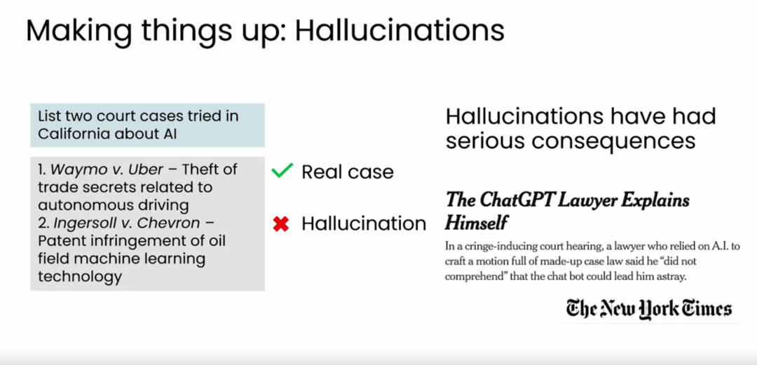 第二个问题就是大语言模型会编造一些事情,我们称这种现象是“幻觉”,一个真实的例子发生在美国,一个律师把通过ChatGPT生成的法律文件提交给法庭,结果在法庭听证时,发现其中的一些案例是虚构的。这也是为什么在使用之前了解LLM的局限性尤其重要。