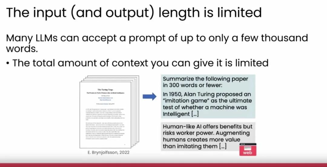 大语言模型目前还存在一个技术限制,即提示语的长度是有限的,它能生成的文本输出长度也是有限的。许多LLM只能接受最多几千字作为提示语,所以你能提供给它的上下文总量是有限的。例如,如果你想让它总结一篇论文,而论文的长度远超过这个输入长度的限制,LLM可能会拒绝处理这个输入,在这种情况下,你可能需要一次提供论文的一部分,然后要求它分部分地总结论文。或者你可以找到一个输入限制较长的LLM,有的可以处理多达数万词的输入。