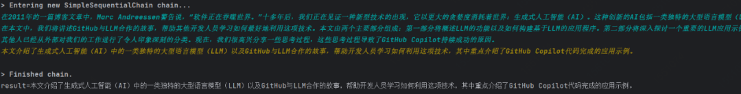 from langchain.chains import LLMChain``from langchain.prompts import PromptTemplate``from langchain.chains import SimpleSequentialChain`` ``first_prompt = PromptTemplate.from_template(` `"翻译下面的内容到中文:"` `"\n\n{content}"``)``# chain 1: 输入:Review 输出:英文的 Review``chain_trans = LLMChain(llm=llm, prompt=first_prompt, output_key="content_zh")`` ``second_prompt = PromptTemplate.from_template(` `"一句话总结下面的内容:"` `"\n\n{content_zh}"``)`` ``chain_summary = LLMChain(llm=llm, prompt=second_prompt)``overall_simple_chain = SimpleSequentialChain(chains=[chain_trans, chain_summary],verbose=True)``content = '''In a blog post authored back in 2011, Marc Andreessen warned that, “Software is eating the world.” Over a decade later, we are witnessing the emergence of a new type of technology that’s consuming the world with even greater voracity: generative artificial intelligence (AI). This innovative AI includes a unique class of large language models (LLM), derived from a decade of groundbreaking research, that are capable of out-performing humans at certain tasks. And you don’t have to have a PhD in machine learning to build with LLMs—developers are already building software with LLMs with basic HTTP requests and natural language prompts.``In this article, we’ll tell the story of GitHub’s work with LLMs to help other developers learn how to best make use of this technology. This post consists of two main sections: the first will describe at a high level how LLMs function and how to build LLM-based applications. The second will dig into an important example of an LLM-based application: GitHub Copilot code completions.``Others have done an impressive job of cataloging our work from the outside. Now, we’re excited to share some of the thought processes that have led to the ongoing success of GitHub Copilot.``'''``result = overall_simple_chain.run(content)``print(f'result={result}')