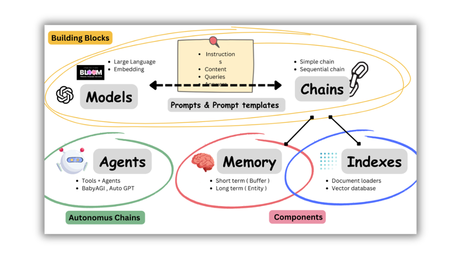 LangChain提供了各种不同的组件帮助使用LLM,如下图所示,核心组件有Models、Indexes、Chains、Memory以及Agent。