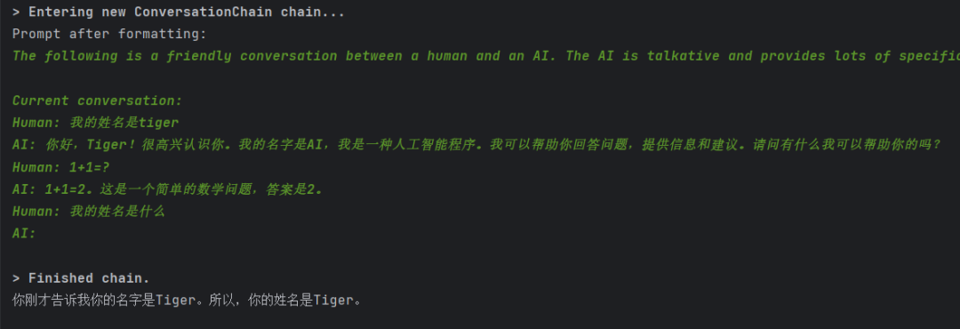 from langchain.chains import ConversationChain``from langchain.memory import ConversationBufferMemory`` ``from azure_chat_llm import llm`` ``memory = ConversationBufferMemory()``conversation = ConversationChain(llm=llm, memory=memory, verbose=True)``print(conversation.prompt)``print(conversation.predict(input="我的姓名是tiger"))``print(conversation.predict(input="1+1=?"))``print(conversation.predict(input="我的姓名是什么"))