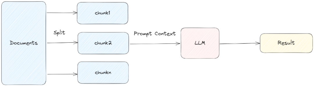 这种方式可以完整的保留上下文,调用LLM的次数也比较少,建议能使用stuff的就使用这种方式。其适合文档拆分的比较小,一次获取文档比较少的场景,不然容易超过token的限制。