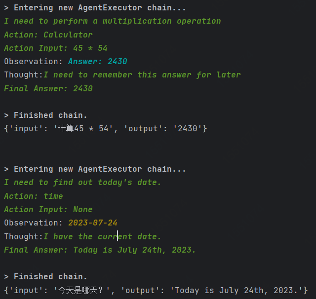 from azure_chat_llm import llm``from langchain.agents import load_tools, initialize_agent, tool``from langchain.agents.agent_types import AgentType``from datetime import date`` ``@tool``def time(text: str) -> str:` `"""` `返回今天的日期。` `"""` `return str(date.today())`` `` ``tools = load_tools(['llm-math'], llm=llm)``tools.append(time)``agent_math = initialize_agent(agent=AgentType.ZERO_SHOT_REACT_DESCRIPTION,` `tools=tools,` `llm=llm,` `verbose=True)``print(agent_math("计算45 * 54"))``print(agent_math("今天是哪天?"))