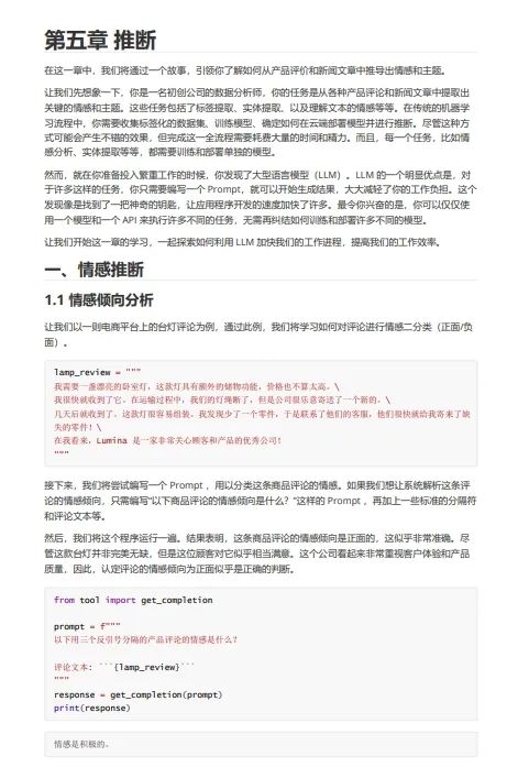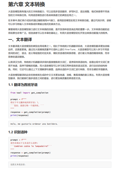 这些教程非常适合开发者学习,以便开始基于LLM实际构建应用程序。我们将该系列课程翻译为中文,并复现其范例代码,其中一个视频还增加了中文字幕,以支持国内中文学习者直接使用,帮助他们更好地学习LLM开发。同时,我们还实现了效果大致相当的中文Prompt,以帮助学习者感受中文语境下LLM的学习使用,对比掌握多语言语境下的Prompt设计与LLM开发。未来,我们还将加入更多高级Prompt技巧,丰富课程内容,帮助开发者掌握更多、更巧妙的Prompt技能。