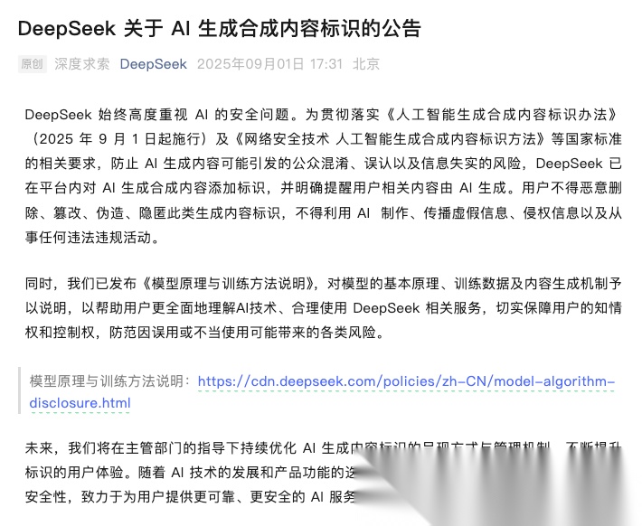 刚刚,DeepSeek 官微发布了最新回应公告——凡是 AI 生成的内容,都会清楚标注「AI 生成」。