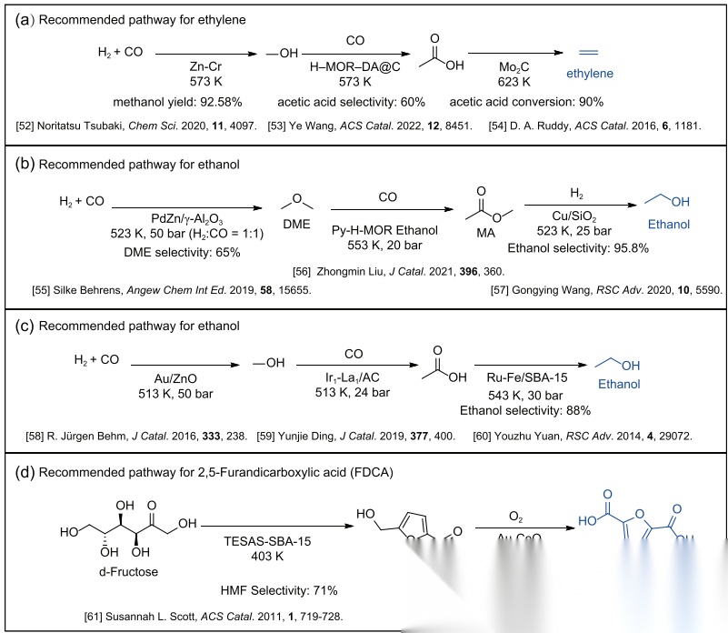 - 1.新路径推荐:为10种有价值的目标化合物(如下烯烃、乙烯、乙二醇、草酸、丙二醇、巴豆醛、1,3-丁二烯、1,4-丁二醇、顺-2-丁烯和2,5-呋喃二甲酸)提出了20条新路径,这些路径在文献中尚未报道。