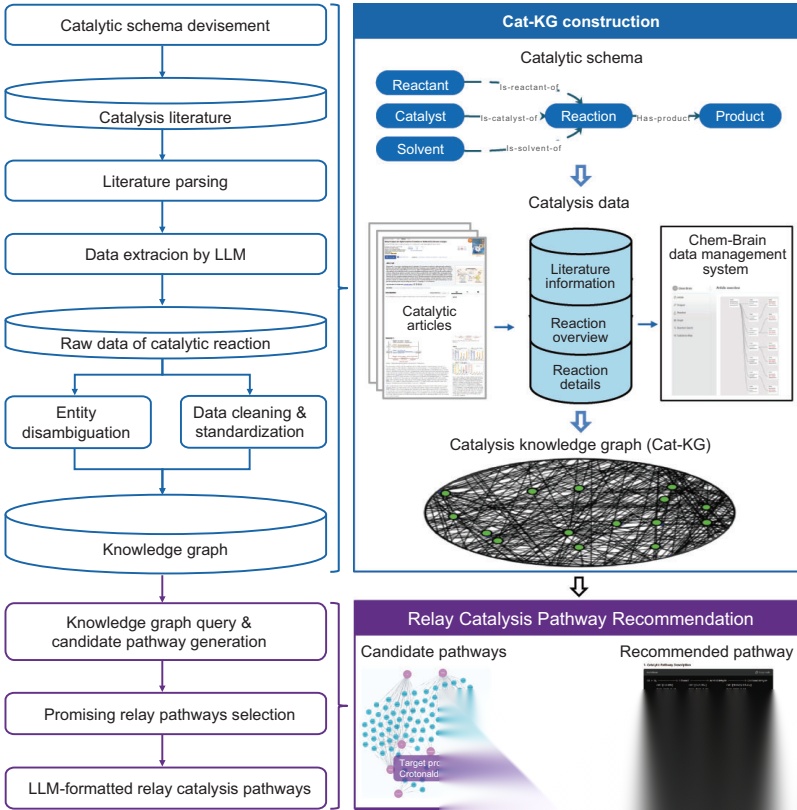 接力催化整合了多个催化反应,以高效转化中间体并提高转化率和选择性。然而,设计这些途径和多功能催化剂的过程通常漫长且成本高昂,严重依赖经验丰富的研究人员进行深入文献分析。为解决这一问题,我们开发了一种结合知识图谱(KG)和大型语言模型(LLMs)的方法,用于自动推荐多步催化反应途径。我们的方法涉及使用LLM辅助的工作流程进行数据采集和组织,然后构建详细的催化知识图谱(Cat-KG)。在查询Cat-KG(一个关于催化知识图谱的数据集)后,通过应用基于继电器催化专业知识的评分规则,识别出有前途的继电器催化路径。大型语言模型(LLM)随后将这些结构化的路径和反应条件数据转换成化学方程式和描述,以便化学家阅读。这一步骤整合了来自Cat-KG的催化知识,并通过使用可靠信息帮助避免LLM引起的幻觉。该方法高效地为乙烯、乙醇、2,5-呋喃二甲酸酯以及其他目标推荐了继电器催化路径,在几分钟内识别出与已报告路径一致的新路径,同时使用不同的反应条件,验证了其有效性。因此,这一策略可以外推已知和新颖的继电器催化路径,展示了其在路径选择中的潜在应用。