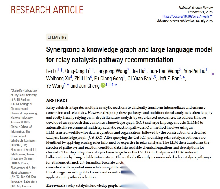 最近,厦门大学程俊教授课题组、王野教授课题组与英国爱丁堡大学Jeff Z. Pan教授课题组等携手合作,成功开发了一种创新性的研究方法。这种方法巧妙地融合了大语言模型(LLM)的强大处理能力与自主构建的催化知识图谱(Cat-KG)的专业数据,专门用于接力催化路径的智能推荐系统。该研究针对接力催化反应路径推荐这一重要科学问题,提出了全新的解决方案。这一突破性研究成果以"Synergizing Knowledge Graph and Large Language Model for Relay Catalysis Pathway Recommendation"为标题正式刊登在权威学术期刊National Science Review上,为催化化学领域的智能化发展提供了重要的技术支撑。