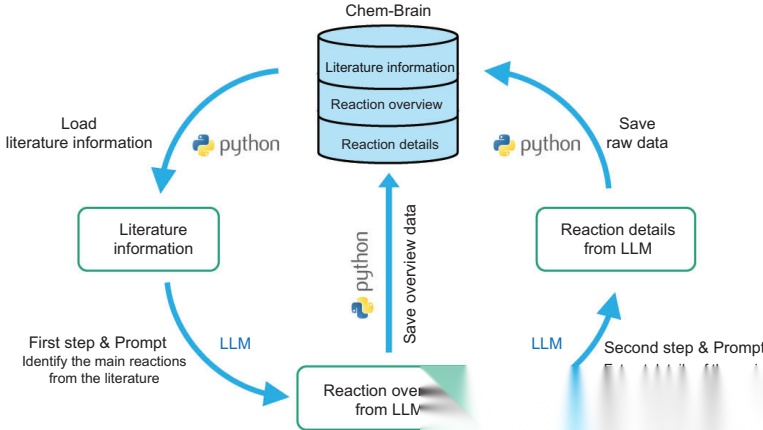 - 2.数据处理:提取的文献信息、反应概览和反应细节首先以JSON格式结构化,然后存储在Chem-Brain平台中。