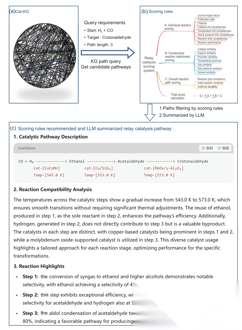 基于Cat-KG的中继催化通路查询、筛选与推荐流程。图(a)展示了Cat-KG的示意图,其中候选通路通过特定知识图谱查询生成。图(b)展示了使用评分规则对这些通路进行过滤和优先级排序的过程。图©呈现了由语言模型优化后的推荐中继催化通路,通过格式化处理提升可读性。