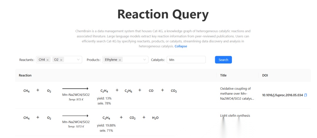 研究团队构建的Cat-KG已实现催化反应的查询功能,并向公众开放,后续还将陆续开放路径查询等应用。