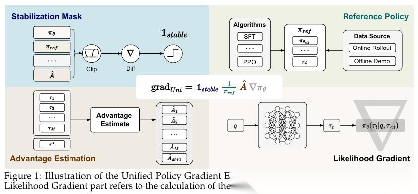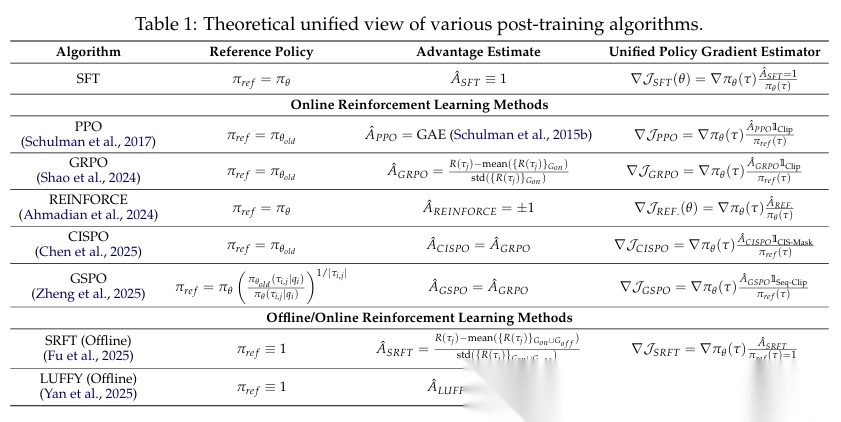 通过对该联合目标进行梯度推导并应用重要性采样,即可导出UPGE的通用形式。这揭示了SFT与RL本质上是同一优化目标在不同数据分布假设和侧重点下的具体体现。