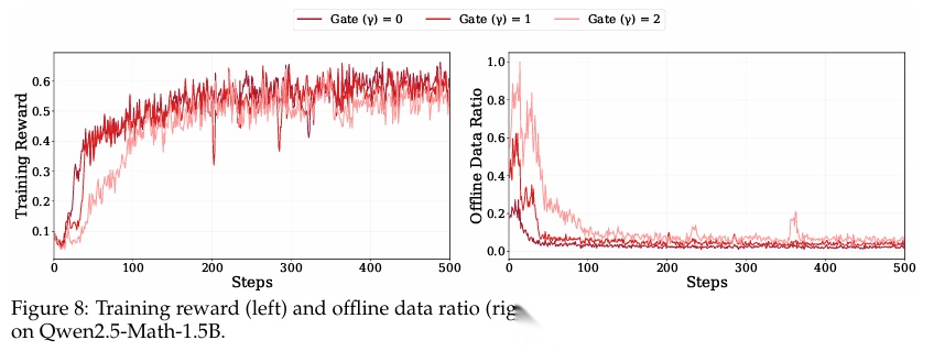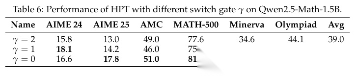 r_0的影响:r_0 = 0(即仅在模型完全无法正确解答时才使用SFT)的设置取得了最佳效果。这表明应尽早引入RL进行探索,过度依赖SFT会限制模型的性能上限。