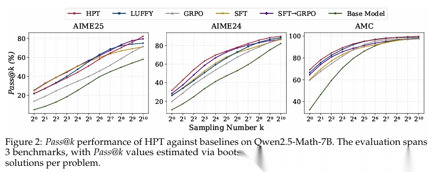 - 探索与利用的平衡:HPT在提升最佳性能(pass@1)的同时,其多样性指标(pass@1024)也显著高于纯RL方法,表明该算法有效平衡了利用(exploitation)与探索(exploration)。