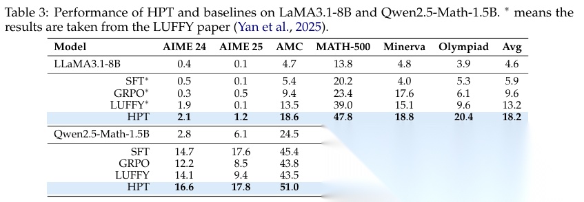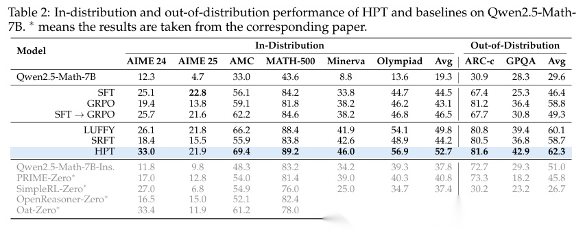实验数据显示,在几乎所有测试的模型和基准上,HPT均取得了当前最佳(SOTA)性能。特别是在分布外泛化测试集上,HPT的优势尤为突出。例如,在Qwen2.5-Math-7B模型上,HPT在AIME 2024基准上的性能比最强的基线方法高出7个百分点。