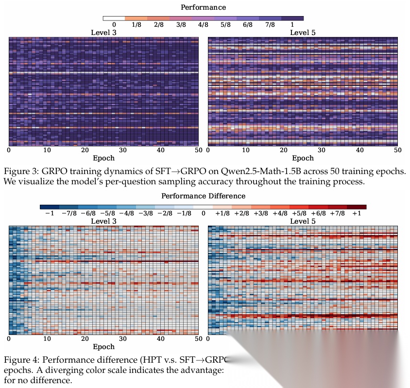 - 知识的习得与保留:分析表明(见表4),HPT能有效解决更多高难度问题(红色数字),并且不会遗忘已掌握的知识(绿色数字稳定),展现了稳健的学习动态。