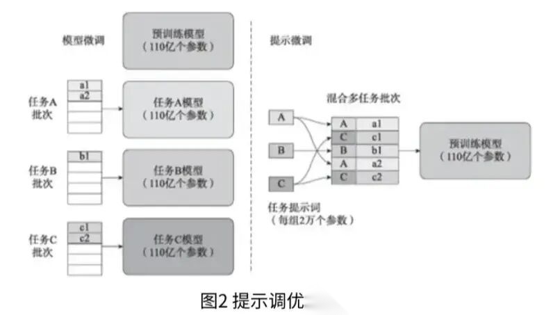 在论文的实验对比中,对于T5-XXL模型,每个经过调整的模型副本需要110亿个参数,相较于为每个下游任务制作特定的预训练模型副本,提示调优需要的参数规模仅为20480个参数。该方法在少样本提示方面表现出色。