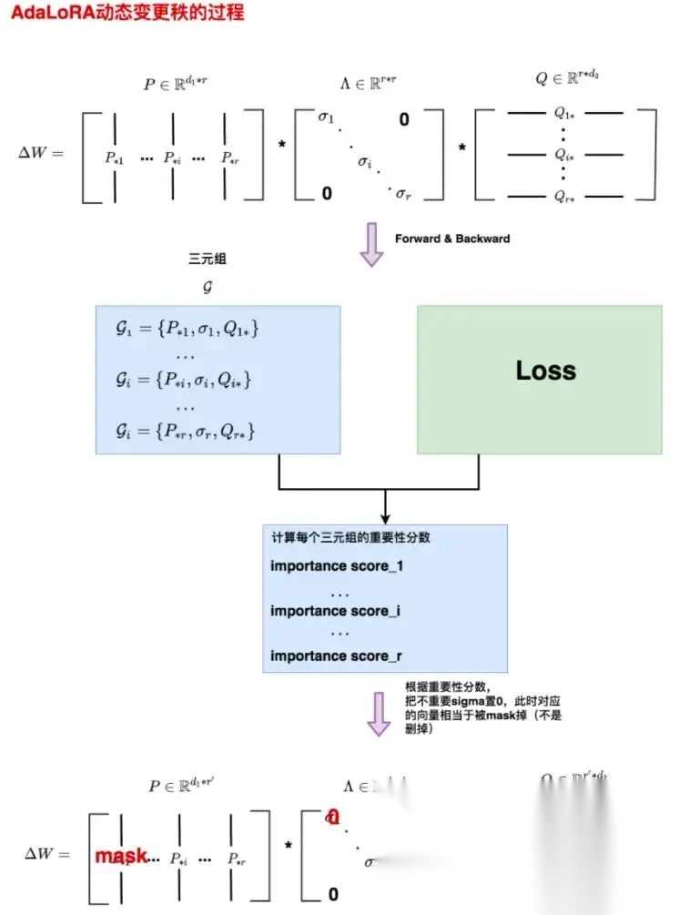 在实际操作中,AdaLoRA采用奇异值分解(SVD)的方法来进行参数训练,根据重要性指标剪裁掉不重要的奇异值来提高计算效率,从而进一步提升模型在微调阶段的效果。