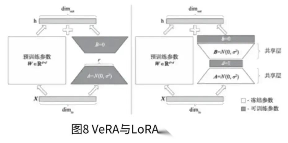 在VeRA中,这些矩阵被冻结,在所有层之间共享,并通过可训练向量和进行适应,从而显著减少可训练参数的数量。