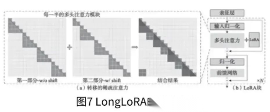 为了在有限的计算成本下扩展预训练大型语言模型的上下文大小,研究者在论文“LongLoRA: Efficient Fine-tuningof Long-ContextLarge LanguageModels”中提出了LongLORA的方法,如图7所示